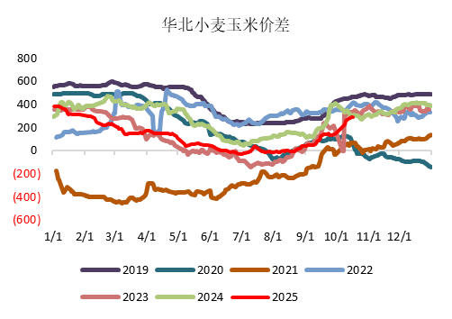 3、小麦-玉米价差,根据往年复盘情况,进入玉米新季上市后,小麦-玉米价差并无过多联动,但基于近期小麦上涨行情、以及冬麦播种进度偏慢,市场给出了玉米远期C2605、C2509较高的升水预期。但当前C1-5价差已经给出较高的远期升水,按照当前现货对C05的基差来看,升水幅度已经能够完全覆盖资金仓储成本。而对于小麦近期上涨,笔者并不乐观,在6-9月托市+收储带动情况下,价格并没有走强,进入10月份小麦走强更多是基于华北玉米受灾引发的,而对于贸易商来说,尽管小麦价格有所上涨,也可能仅仅覆盖前期收购的资金仓储成本。进入11月份,市场传闻的拍卖是否启动,且临储小麦19、21年仍有大量库存待消化,而进入明年一季度,央储、地储陆续拍卖,也将限制价格进一步上涨空间,这或将对小麦市场带来新的偏差。