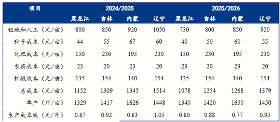2、东北单产提升、集港成本大幅下移。按照前期4-5月份春播调研预估,本年度东北产区地租下滑带动种植成本下移,当时按照单产水平持平预估,黑龙江、吉林主产区种植成本推港口在2000-2050左右,而今年东北产季天气较好、单产大幅提升,尤其是黑吉主产区,预计种植成本推港口将进一步下移至1900-1950左右。这会进一步下移贸易商的建库意愿和成本预期。尽管前期盘面低点跌破2100,但按照新的种植成本来看,盘面溢价仍然较高。当前现货高于去年同期,因此农户种植收益同比大幅修复。因此,预计今年收储政策可能偏晚才会发布。