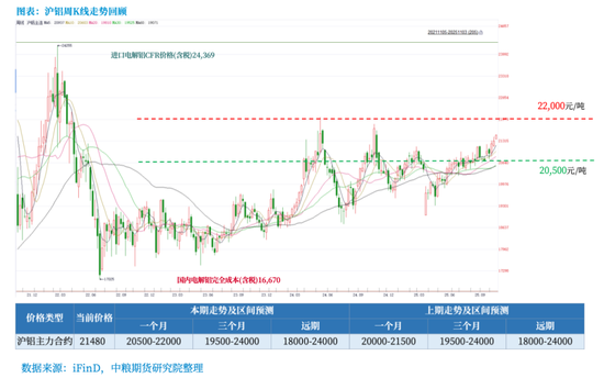 短期,国内产能维持高位,成本持续下降推动电解铝利润维持高位并进一步扩大;进口窗口持续开启;高价对下游补库及消费存在一定压制,终端各板块表现分化,总体需求保持平稳。电解铝价格区间为 [20500, 22000] 元 / 吨。