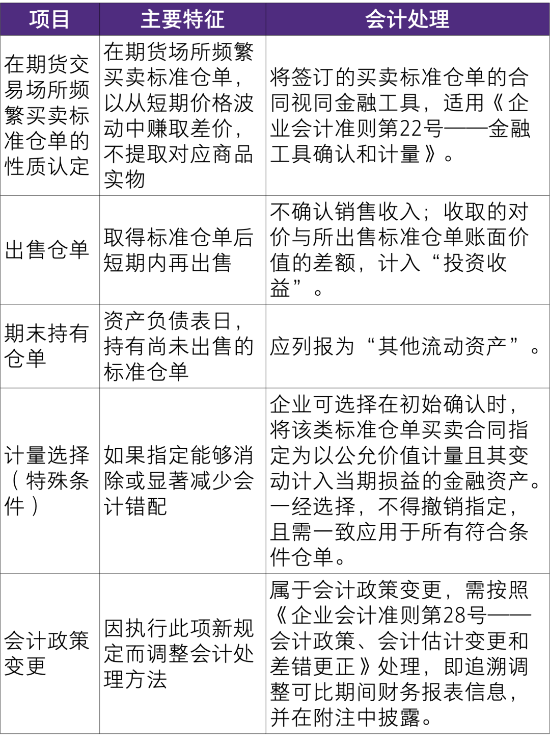 4.标准仓单。企业因执行标准仓单相关规定而调整会计处理方法的,按照《企业会计准则第28号——会计政策、会计估计变更和差错更正》等相关规定,应当对财务报表可比期间信息进行调整,并在财务报表附注中披露相关情况。