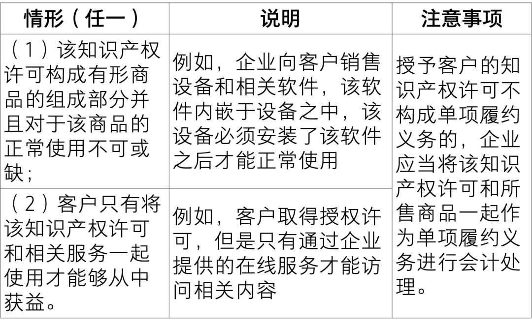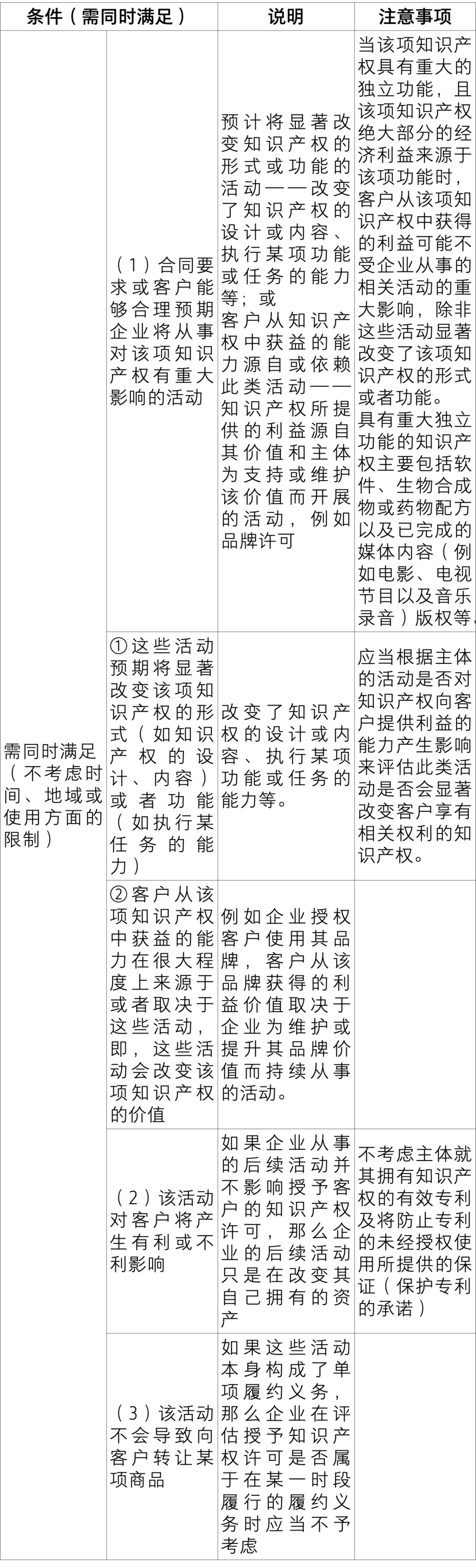 5.授予知识产权许可。企业向客户授予知识产权许可的,应当结合具体业务模式,综合分析是否同时满足合同要求或客户能够合理预期企业将从事对该项知识产权有重大影响的活动、该活动对客户将产生有利或不利影响、该活动不会导致向客户转让某项商品三项条件,判断该授予知识产权许可行为属于在某一时段内履行的履约义务还是在某一时点履行的履约义务。企业不得仅因授予被许可方在一定期间内使用某知识产权许可即直接判断在授权期间内分期确认收入。