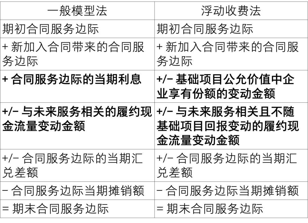 后续计量中,对合同服务边际的处理有所不同。一般模型法下,合同服务边际吸收除“折现率变动引发”以外的所有与未来服务相关的履约现金流量变动;浮动收费法下,合同服务边际吸收所有与未来服务相关的履约现金流量变动,包括期末折现率变动引发的履约现金流量变动。