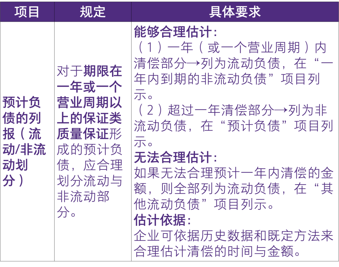 企业应当正确划分流动负债和非流动负债,合理确定资产负债表中“预计负债”项目的列示金额。对于期限在一年或一个营业周期以上的保证类质量保证形成的预计负债,企业应当将预计未来一年或一个营业周期以内清偿的保证类质量保证形成的预计负债金额计入流动负债,并在资产负债表中“一年内到期的非流动负债”项目列示,其余计入非流动负债,并在资产负债表中“预计负债”项目列示;如果企业不能合理预计未来一年或一个营业周期以内清偿的保证类质量保证形成的预计负债金额,则全部计入流动负债,在资产负债表中“其他流动负债”项目列示。企业可以依照确定预计负债的历史数据和方法,合理估计预计清偿的金额和时间。
