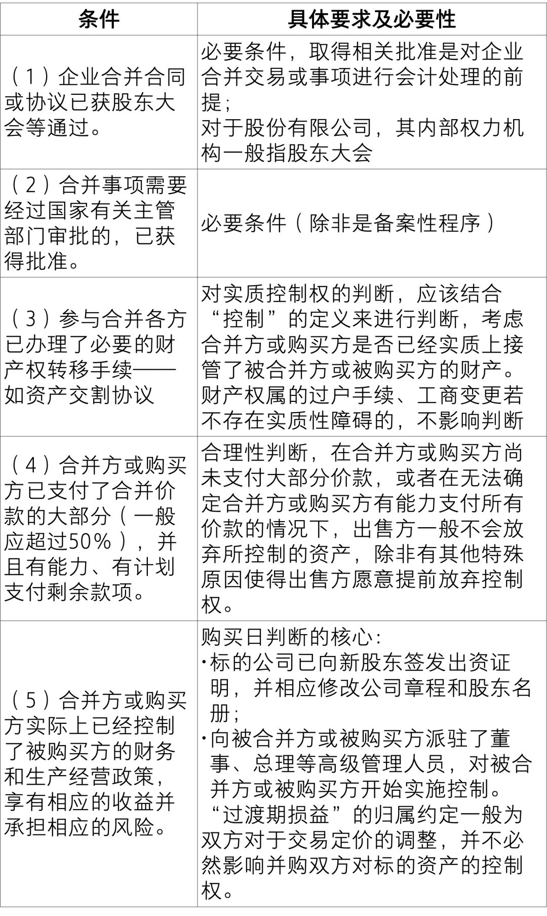 根据《企业会计准则应用指南汇编2024》“第二十章 企业合并”,确定购买日的基本原则是控制权转移的时点。企业在实务操作中,应当结合合并合同或协议的约定及其他有关的影响因素,按照实质重于形式的原则进行判断。同时满足了下列条件时,一般可认为实现了控制权的转移,形成购买日:
