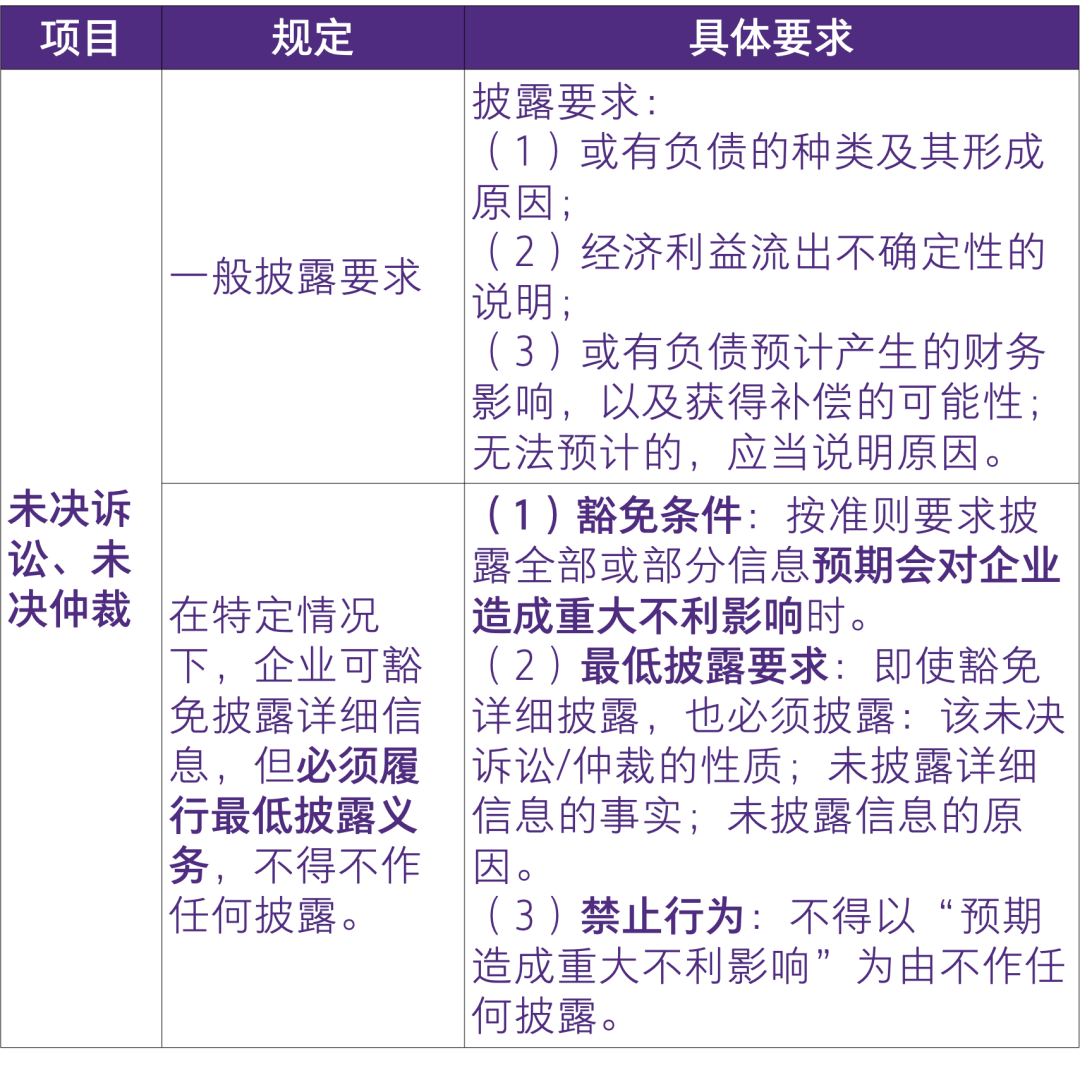 在涉及未决诉讼、未决仲裁的情况下,按照《企业会计准则第13号——或有事项》(财会〔2006〕3号,以下简称或有事项准则)第十四条的规定披露有关预计负债、或有负债等的全部或部分信息预期对企业造成重大不利影响的,企业无须披露这些信息,但仍应当披露该未决诉讼、未决仲裁的性质以及未披露这些信息的事实和原因,不得以预期对企业造成重大不利影响为由不作任何披露。