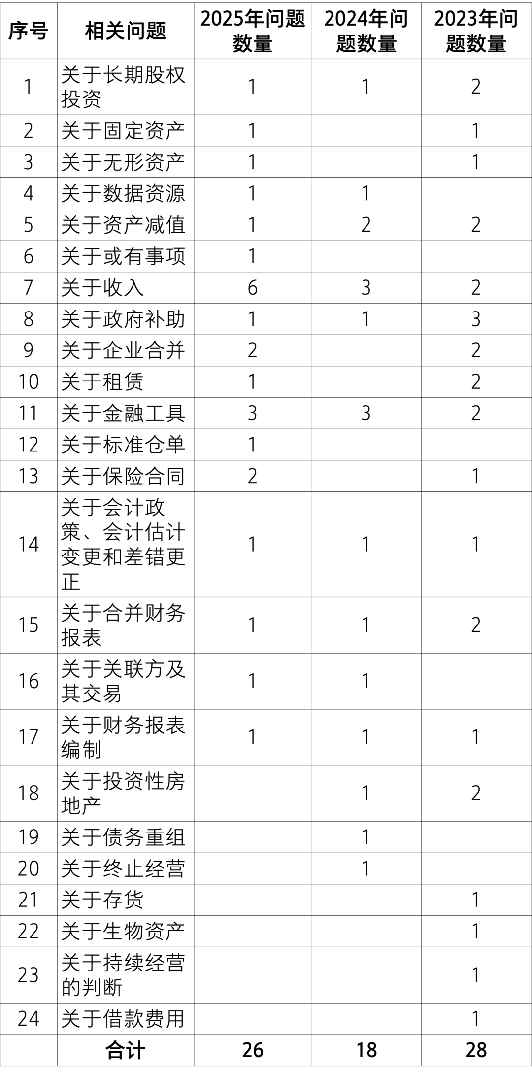 自2020年以来,财政部、国务院国资委、金融监管总局(原银保监会)和证监会连续6年联合发布了“关于严格执行企业会计准则切实做好企业年报工作的通知”。近三年年报通知中应予以关注的准则实施重点技术问题分布情况如下表所示: